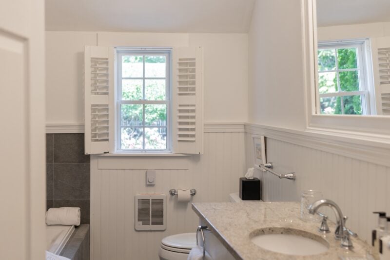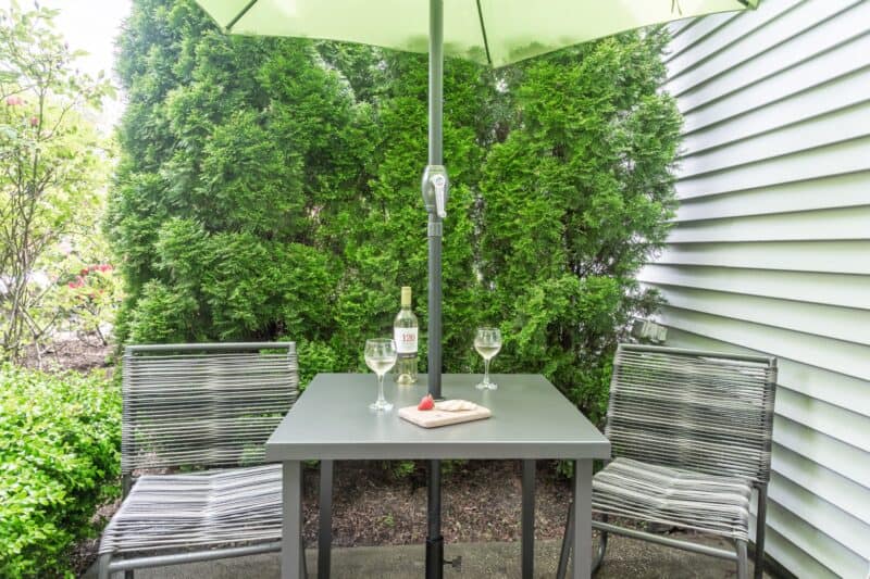 Inside you will find everything to make this a memorable vacation. Room #8 boasts vaulted ceilings, sitting area with a gas fireplace and forty inch flat screen TV/DVD, king-size bed, a coffee bar with drink refrigerator, and an ergonomic desk with adjustable height. The large bathroom offers a soaking tub, separate stand-up shower with rain head that also has a second adjustable head. Our goal is to ensure a relaxing, good time. In nice weather enjoy breakfast outside on your private terrace in the rose garden. This can be the vacation you have waited for, in luxurious comfort and style.
